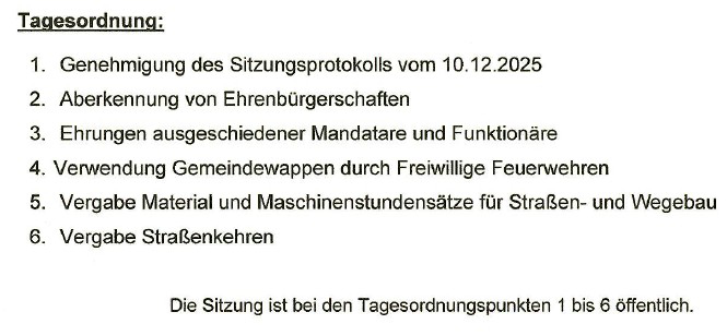 Tagesordnungspunkte der Gemeinderatssitzung, 12. Februar 2026